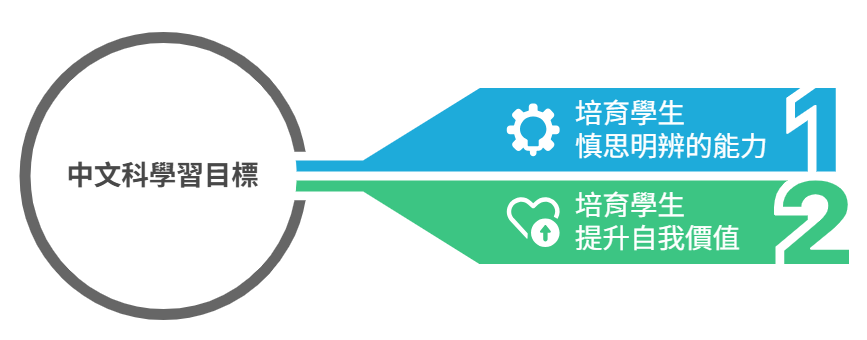 - 創設多元化的中文學習情境,共同培育學生具備正向人際關係,發掘個人的才能及強項,抱持成長性思維,樂於迎向未來,成為具自信心及幸福感的人。